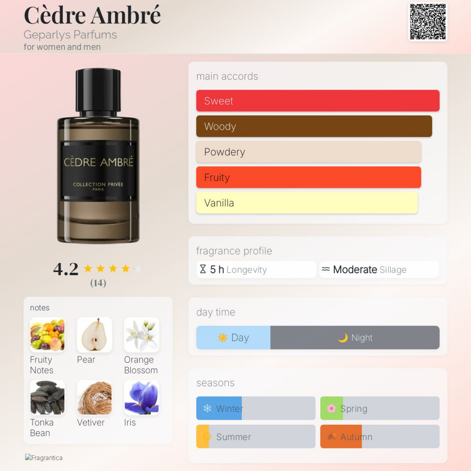 Notes de fond: Vanille, Cèdre, Ambre, Musc