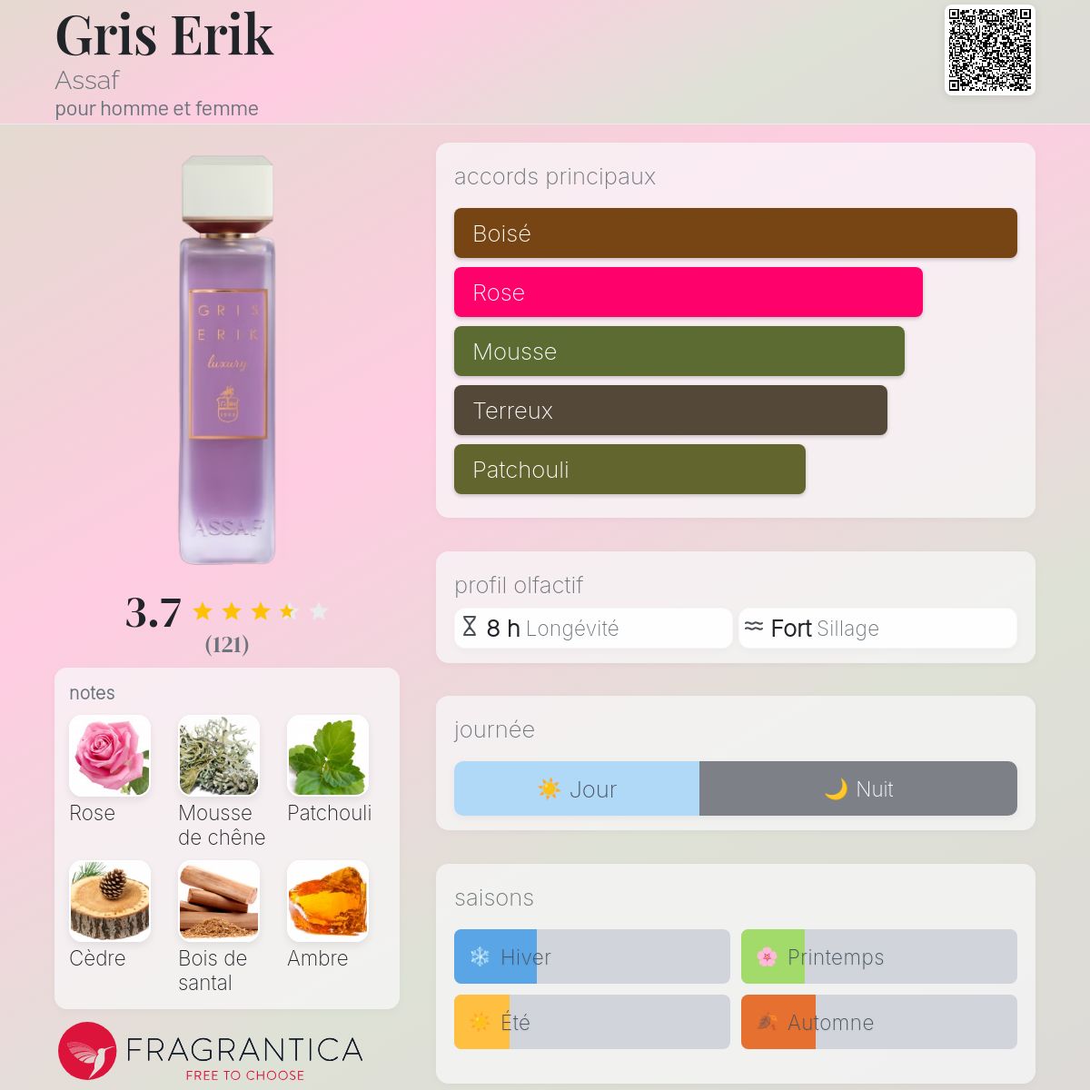 Notes: Rose, Mousse de Chêne, Patchouli, Cèdre, Ambre, Bergamote
